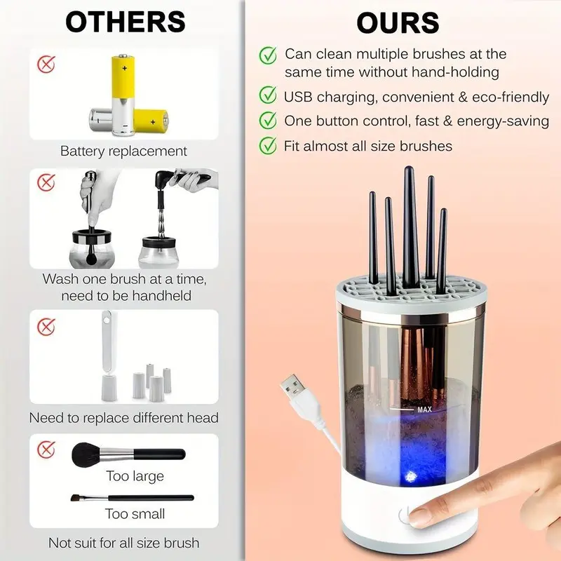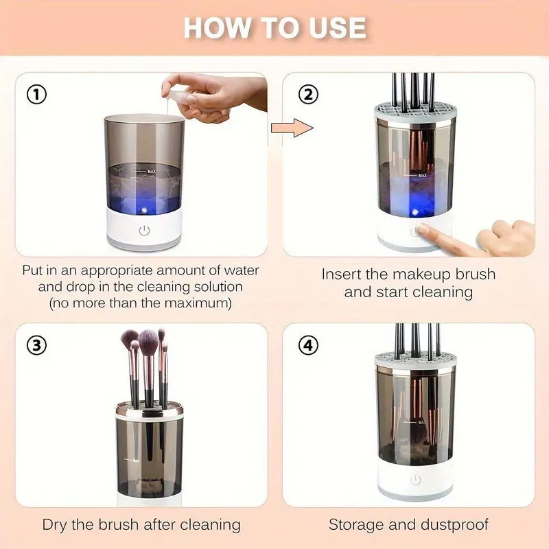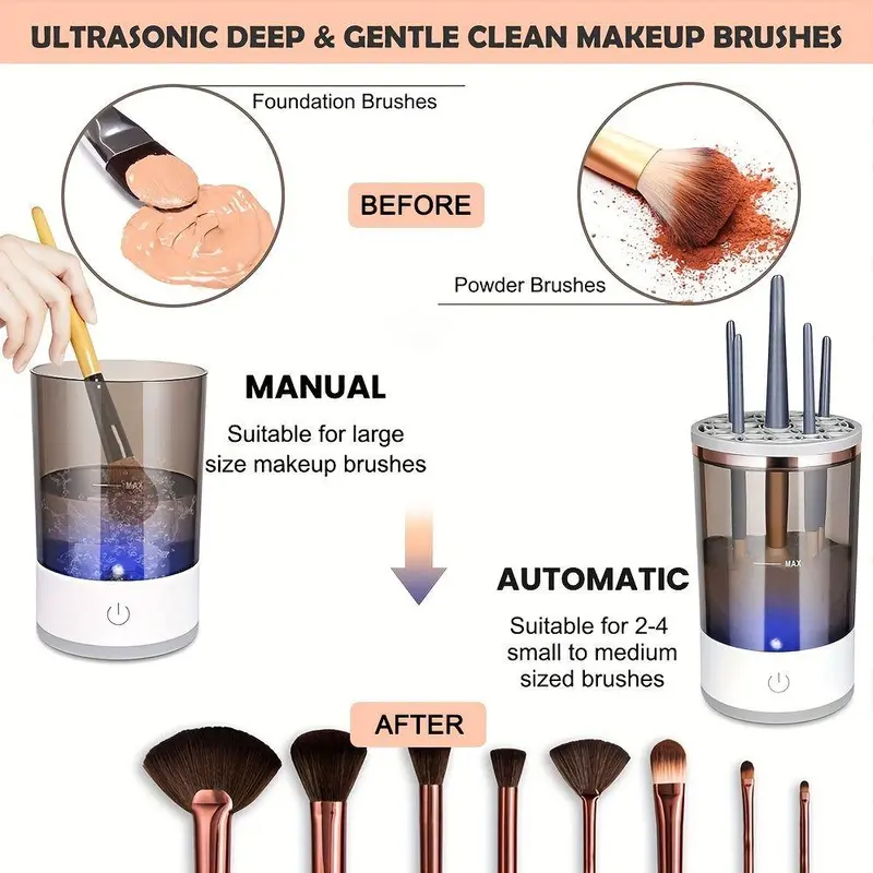 【Versatile Brush Compatibility】: Designed to clean multiple brushes simultaneously, this electric makeup brush cleaner is compatible with a wide range of brush sizes, from foundation to detailed eye brushes.